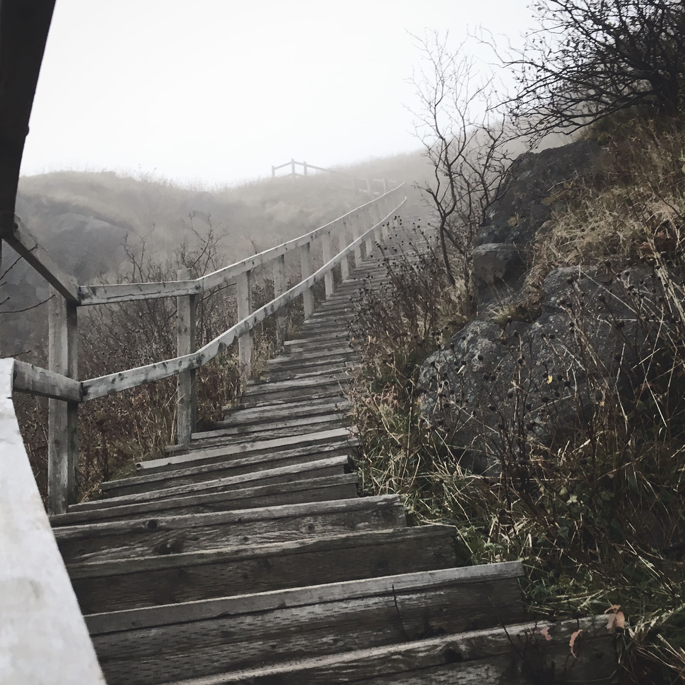 The North Head Trail stitches downtown St. John’s to the edge of the Atlantic. It feels sewn into the hillside, alternating between boardwalk and bedrock, threading in and out of fog. It meanders along the steep coastline above the Narrows, wends around Ross’s Valley to the headland, then ascends abruptly to the summit of Signal Hill.